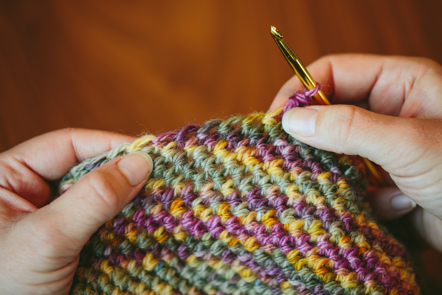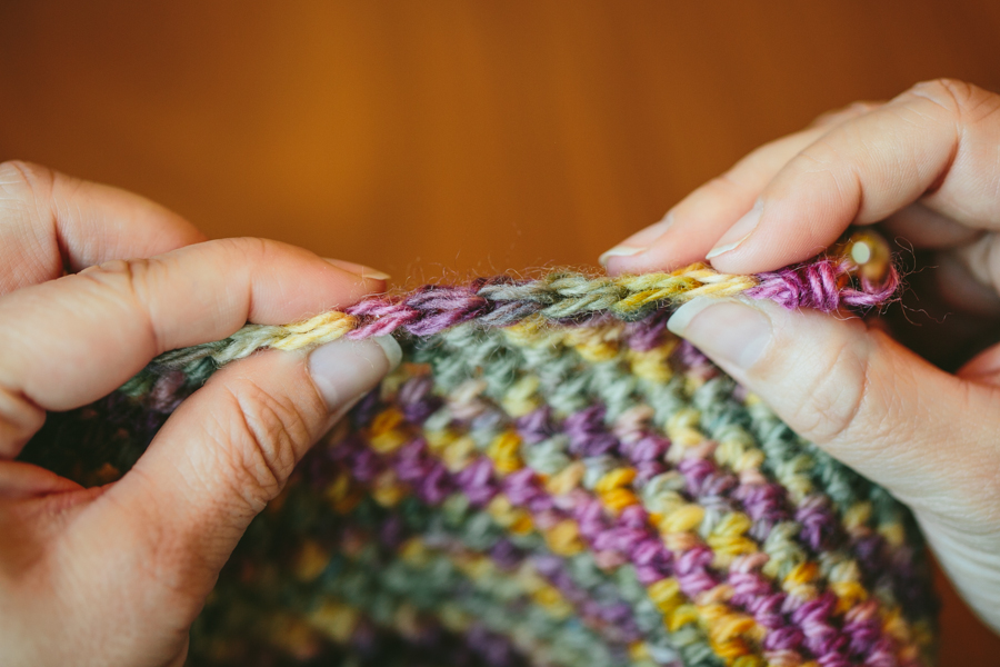The first is to look at the stitches from the side, just like you do when you crochet. I worked a single crochet (sc) in 5 stitches then pulled them out. Notice how there are raised loops between my thumbs? Each loop is a stitch. From my left thumb: 1 yellow, 1 light purple, 1 dark purple, 1 purple/green, 1 green, 1 yellow.