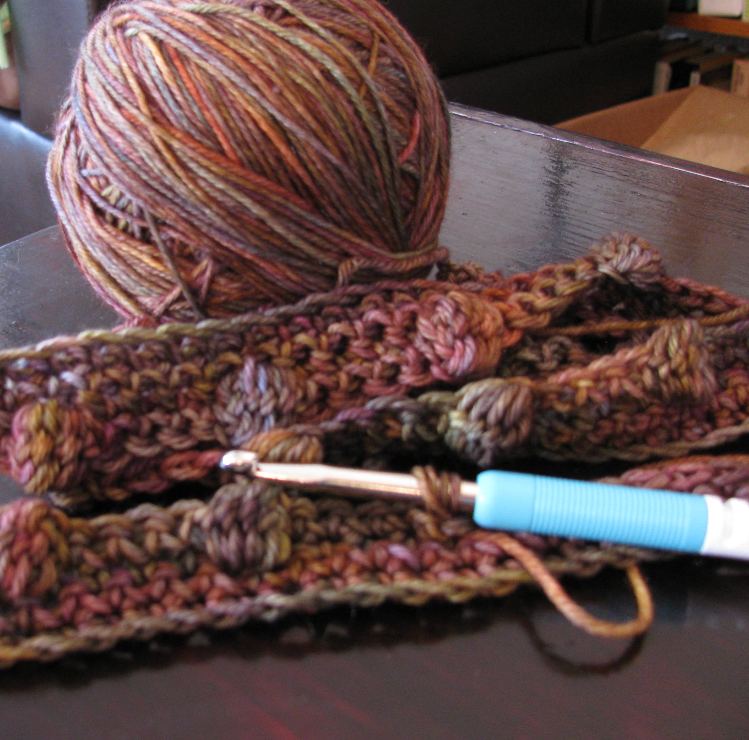 I am teaching a class and I wanted to make one of the pattern choices a bit more challenging for those who have been crocheting for awhile. The beginner scarf is composed of single and double crochet stitches – very basic and easy to master. The easy scarf is composed of single crochet, V-stitch, and double crochet clusters – the repeated panels make for a lovely fabric.