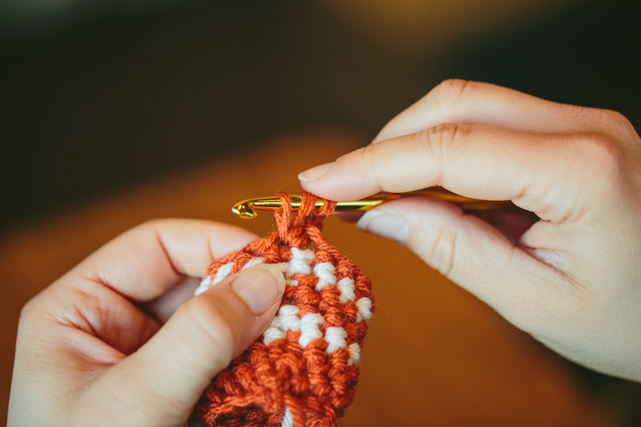 4. Yoh and draw the yarn you just wrapped around the hook through two loops. One loop remains on hook. One double crochet made.