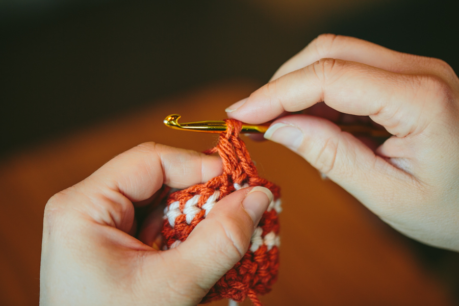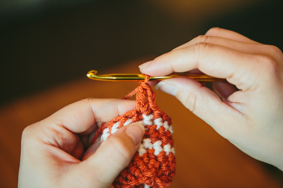 The double crochet (dc) is a great stitch to quickly add height to a row. One dc row usually equals two single crochet rows.