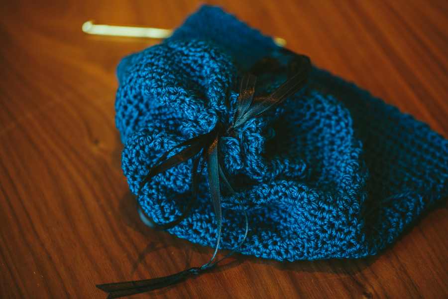 Second ribbon row: In the second to last row, beginning at the opposite side of the tube from where the first ribbon is tied, weave ribbon over and under 1 stitch every 10 stitches. Stagger the stitch weaved under so it sits in the middle of the stitch woven under in the first row. Making the length the same as the first ribbon, cut and tie ends together.