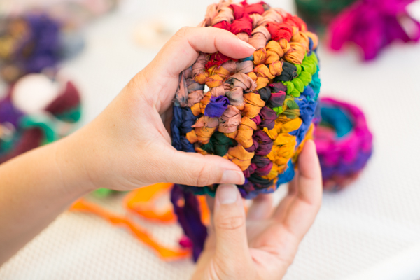 If you want the hole open, sew the end inside the bowl off to the side. If you want the hole filled, just fold the end in half and push it through the center (as pictured) then sew to secure. For a different look, use another color for the center.
