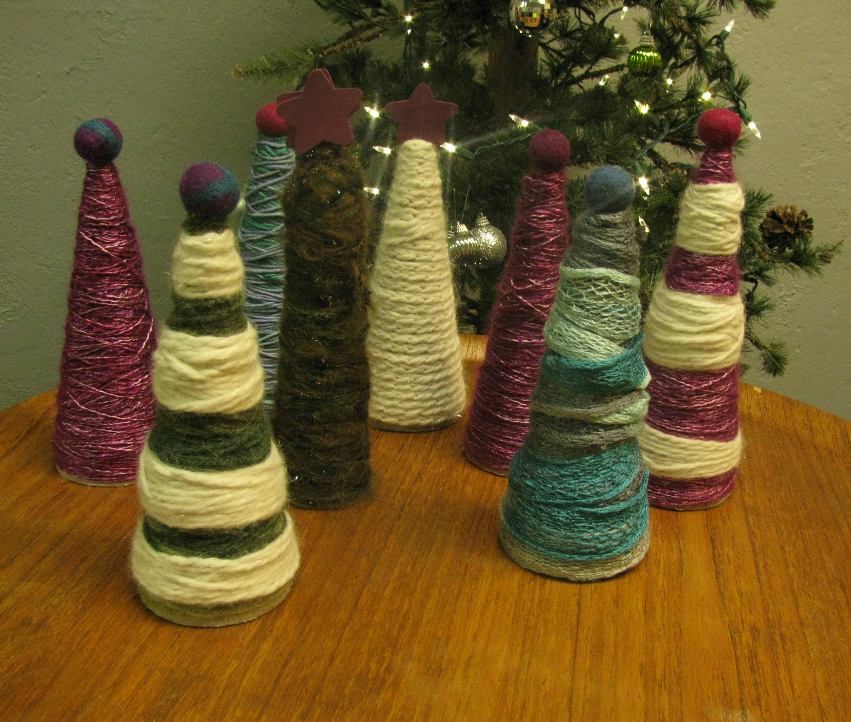 Here’s a kid friendly Christmas project – yarn wrapped Christmas trees. The trees pictured were made by 8 year old girls in a class I taught at The Dancing Sheep Yarn & Fiber here in Casper, WY. As you can see, we had a lot of fun!