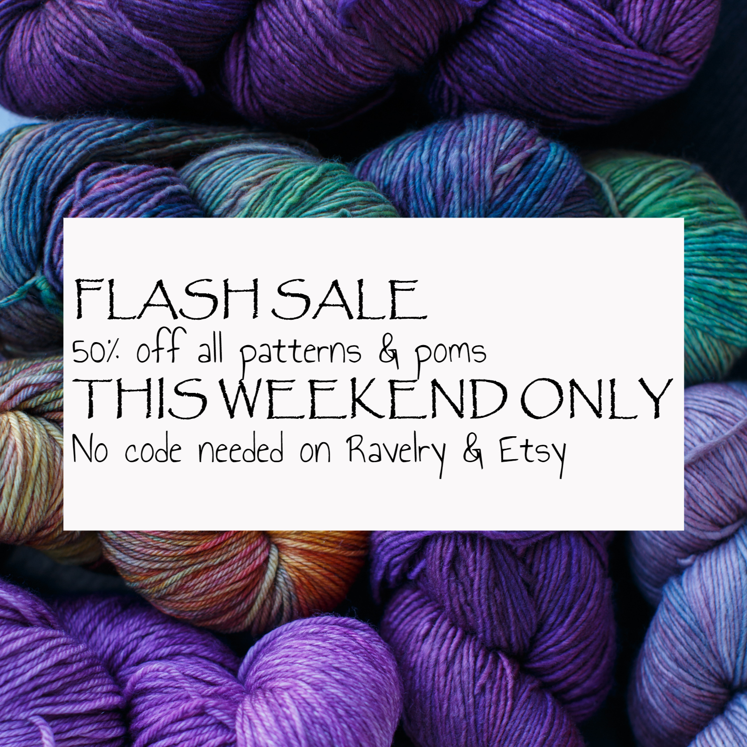 FLASH SALE this weekend only. EVERYTHING is 50% off! Poms, patterns, eBooks, crochet items!
