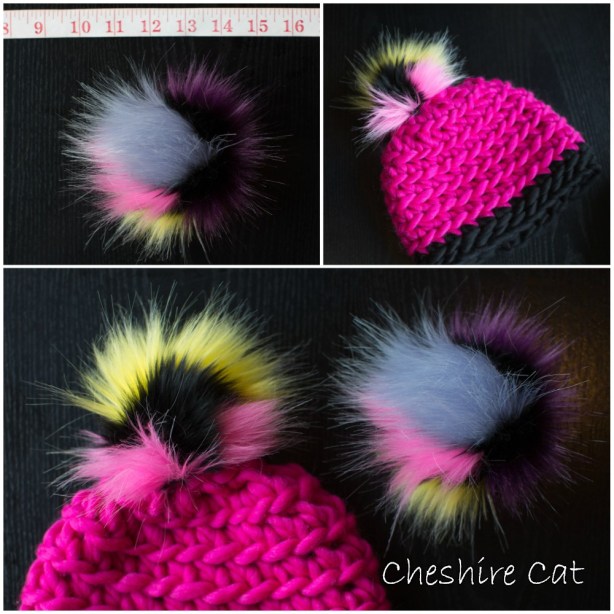 Cheshire Cat – Super soft and multicolored with long and short pile. Each pom is one of a kind with its own variations in color placement and amount of color!