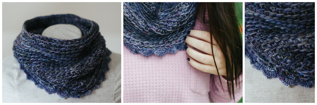 This cowl is designed with two very special yarns by Running On Yarn – both were created for the Solar Eclipse Festival in Casper WY back in 2017 when the eclipse path was at 100% totality over this fine western city. (I almost made it there in time – just to the outskirts of town. Apparently, 99.99% coverage is still REALLY bright! But we were able to experience the eclipse’s eerie effects none-the-less.) Make this cowl in one color, or alternate two colors (as pictured).