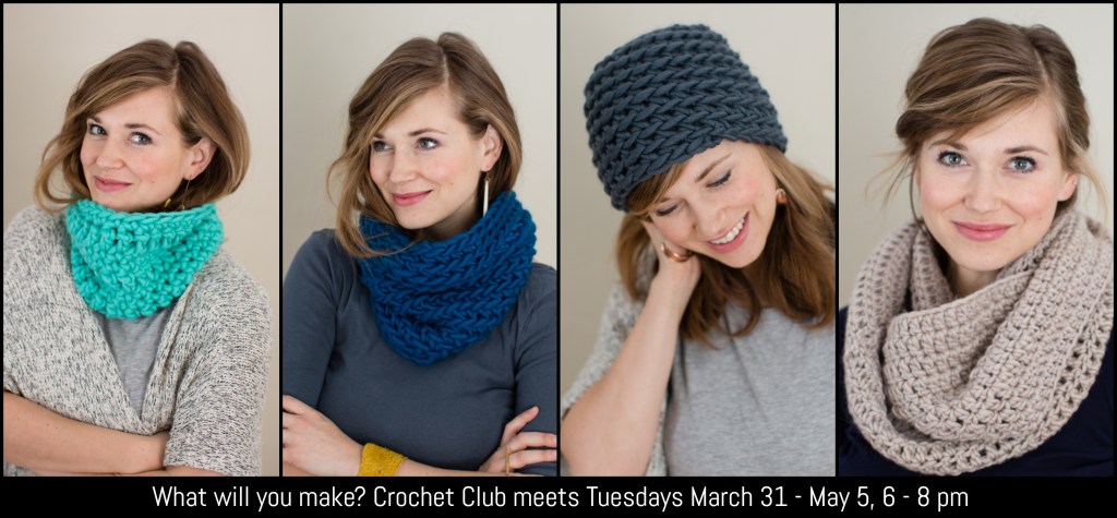 Want to learn to crochet? Afraid to try? Come learn with teacher and crochet designer Abbey Swanson of The Firefly Hook. We will learn the basics of crochet and make a cowl. Everyone leaves with a cowl around their neck! And if you have crochet experience, you can learn a new stitch (or two!) and expand your crochet skills. No experience necessary. Supplies included!