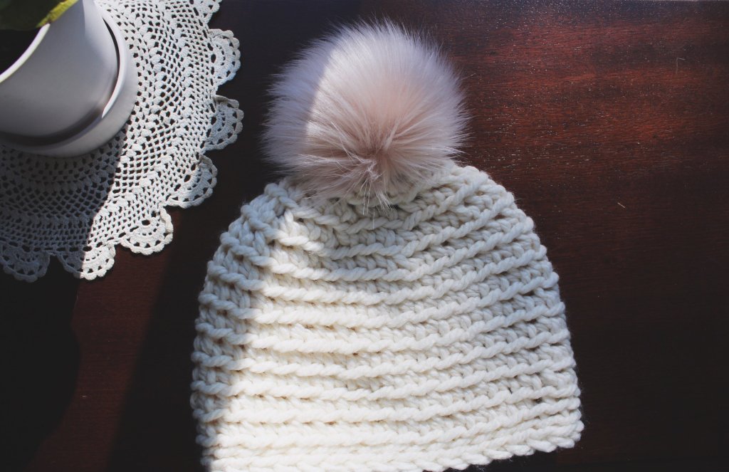 Option 1: Bring a 12 – 15 mm crochet hook and 1 – 2 skeins of super bulky yarn to each class. Your last hat will need 2 skeins of bulky yarn and a 9 mm hook. Faux fur poms available for $5 each.