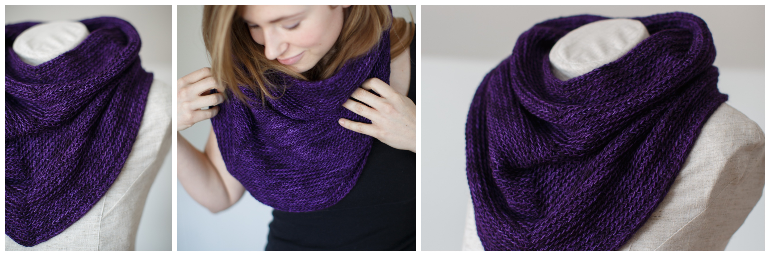 This cowl is worked in one piece holding two strands of yarn (one from each skein) together and increasing in the same place each round. Two single crochet stitches are worked to create the triangle at the front of the piece. When working this increase, alternate working in the first and second sc to keep the triangle straight.