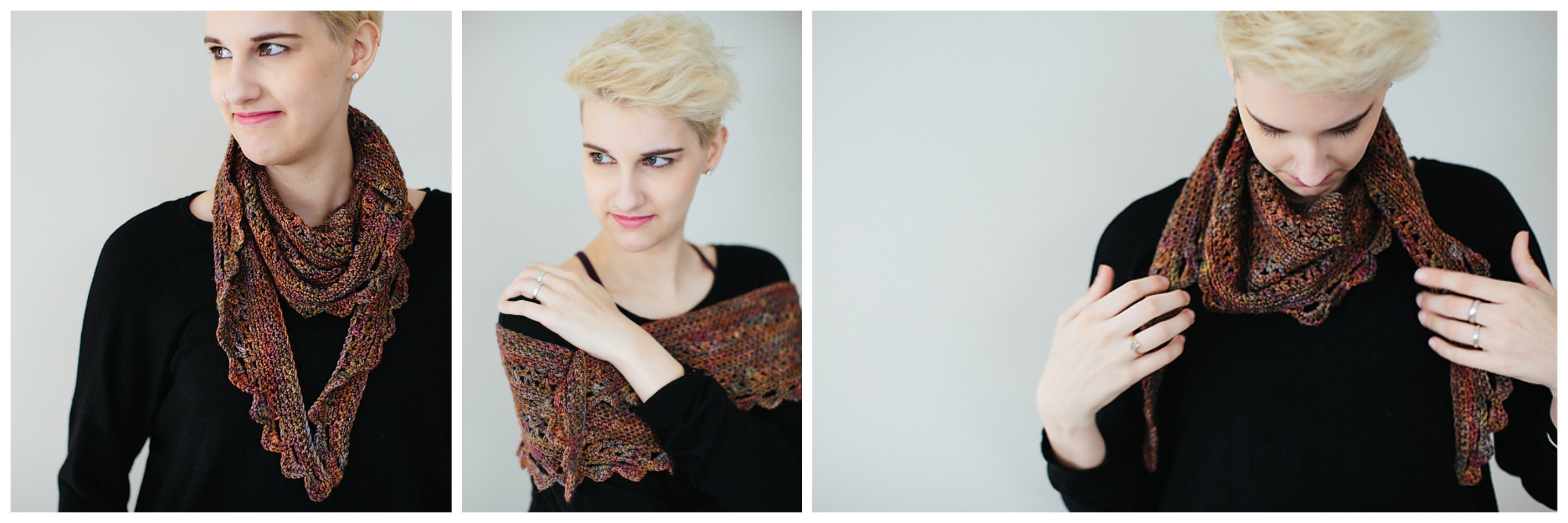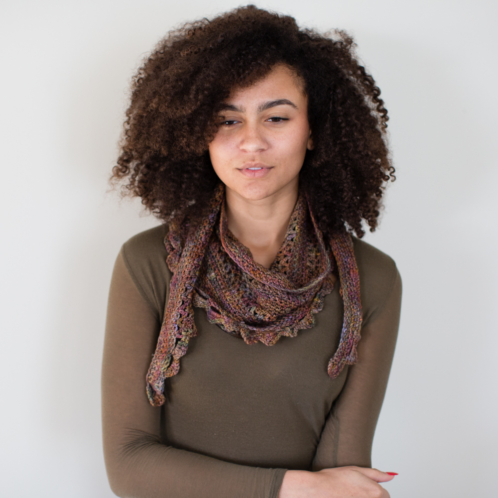 Cool breezes and warm sun, weather that changes on a dime…autumn can be paradoxical and deserves a lovely tribute. This soft handkerchief scarf can be worn over the shoulders or around the neck, adding a gorgeous structural element to any outfit. The double cluster and v stitch work together to create a lacy effect. This scarf is great for those who have mastered basic stitches and are ready to learn a few advanced stitches.
