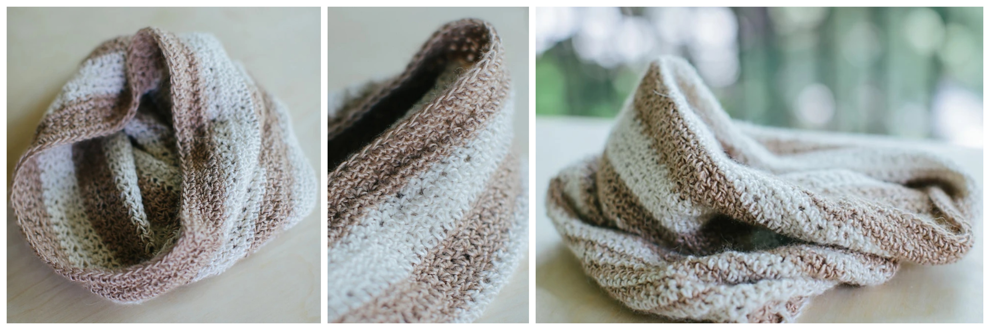This cowl hat works up beautifully with stripes of color that get progressively wider as you work through the pattern. Use the tail of the chain to help keep track of rows. From row 5 to the end of the piece, you can move on to the next row once you come around to the chain tail.