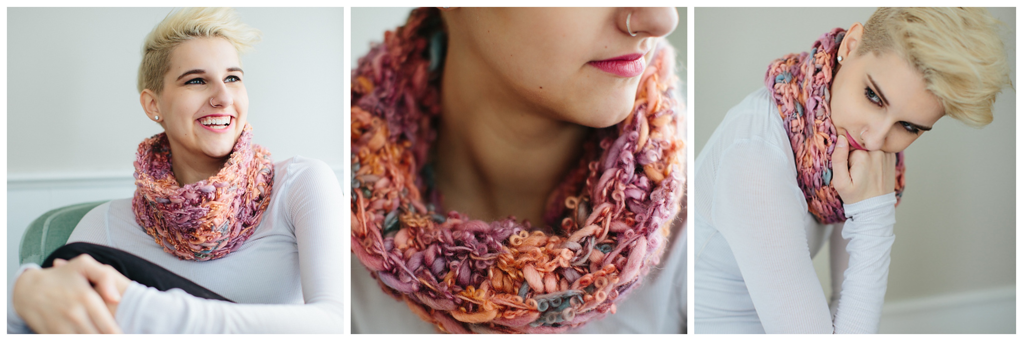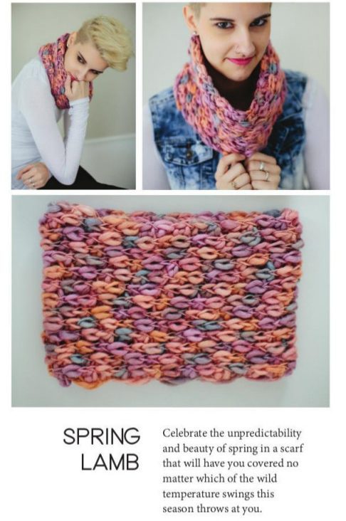 Here are some fun boucle yarns you can add to another yarn from your stash to get the look of this scarf! Hold the strands together as one (use enough strands to equal the weight of a super bulky yarn).