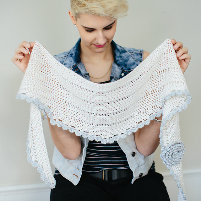 Stitches are reduced in each row by working chains and skipping stitches until the scarf reaches a rounded point at the end. Once the main section is complete, the edging is created by working specific stitches in each chain space (and dc sts along the edge) created at the beginning of each row. The scarf body will curl in on itself until the edging is complete. Block as needed to keep edges straight. Scarf is slightly asymmetrical.