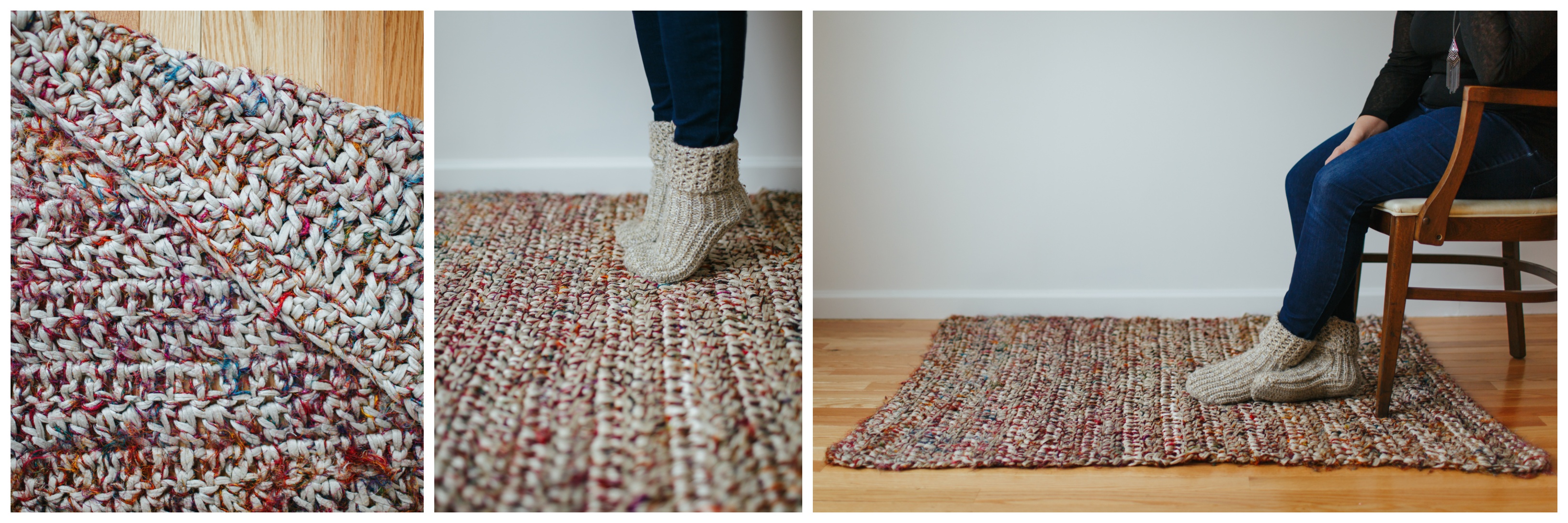 I designed these rugs for my boho living room. I started with “Use What You’ve Got,” playing with the various fabric yarns I had on hand. Without this playful experiment, I would have never stumbled upon the combination in “Fancy Jersey.” (See if you can spot the combo at the bottom of the photo on the above left.) I love the idea of making things for your own home. Think of what you’d pay for a custom piece anywhere else! And Use What You’ve Got is a lesson in “waste not, want not” –an adage older than “Earth Day” passed down from a generation that has less, used what they had, and wasted almost nothing.
