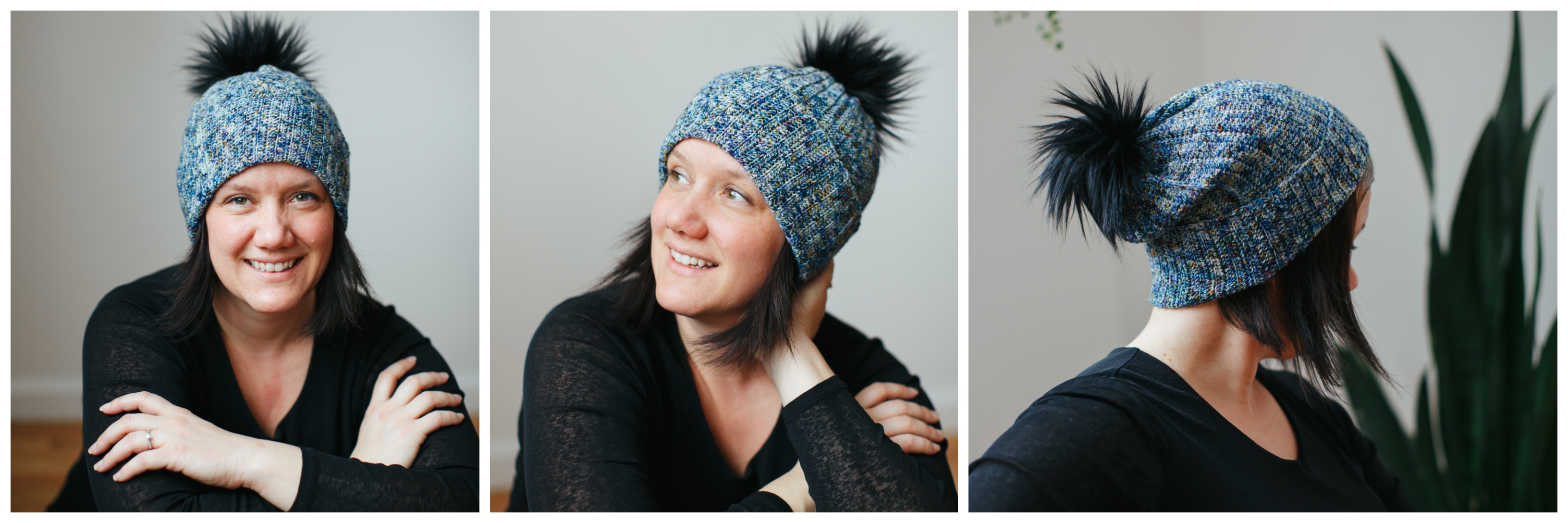 The charm of exploring a tide pool is in expecting the unexpected. Beautiful and always surprising, tide pools are one of my loves. This hat shimmers in blues and greens and its construction is an adventure in unpredictability! The sideways construction allows for a huge negative ease found only in knit fabrics.