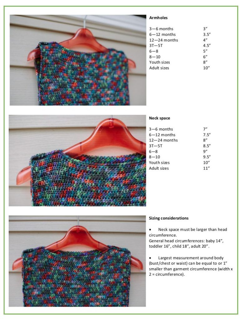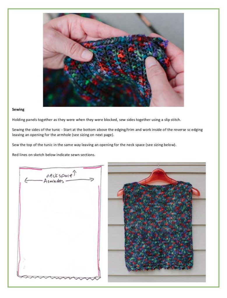 Tunic is worked in two sections: a front panel and a back panel. The two panels are sewn together with openings remaining for the neck and armholes.