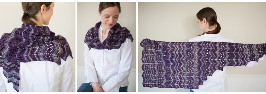 Flickering with purple fire, this asymmetrical shawl will wrap you in the warmth and wonder of a dragon wing.
